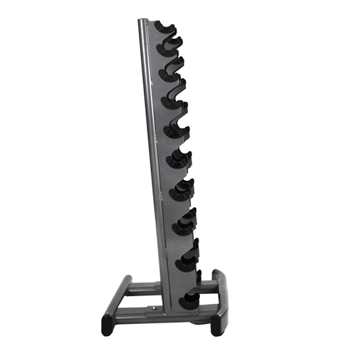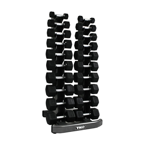 This vertical dumbbell rack can store 10 pairs of rubber hex (up to 50lbs) or beauty bell dumbbells in a compact 29″ x 24″ area.
